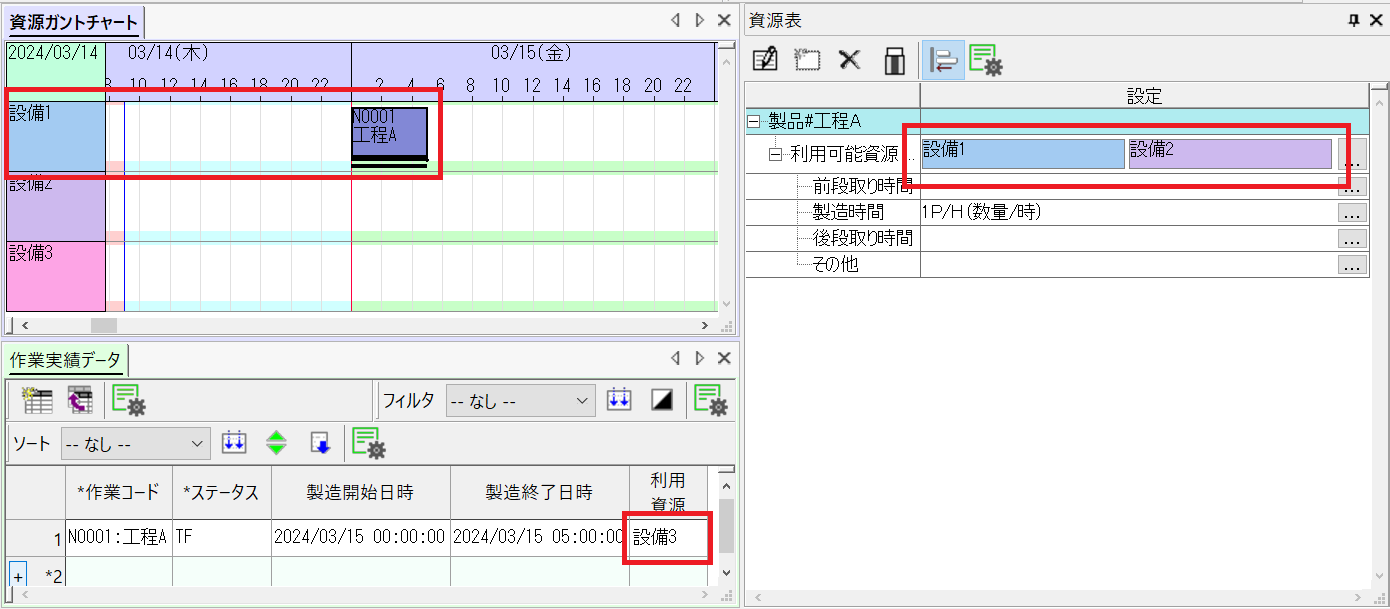 今后通过设置,还可以更新副资源(资源2)上先行作业0003与后续作业0004的换线设置。(也可以像以前一样仅针对主资源。)