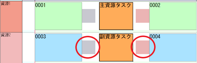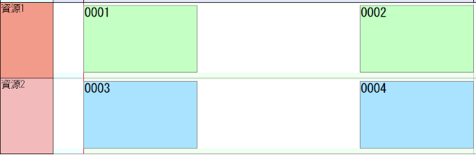 如上图所示,在作业0001~0004已被分配的状态下,假设有一个以资源1为主资源、资源2为副资源的作业被插入其间。