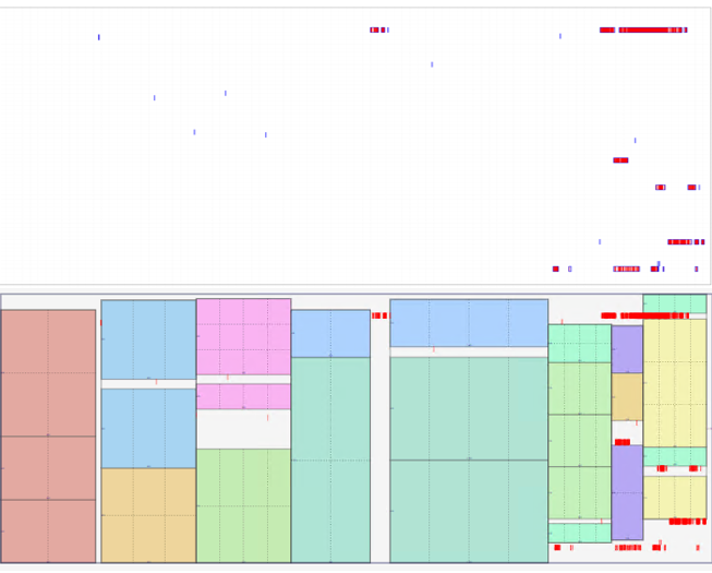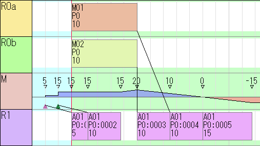 通过甘特图可清晰确认各分切机的工作分配情况。此外,还通过详细图表展示了母材的切割方式,可直观理解当具有相同要求的二次分切需同时进行横向切割时,或无法同时进行时按顺序规划的流程。