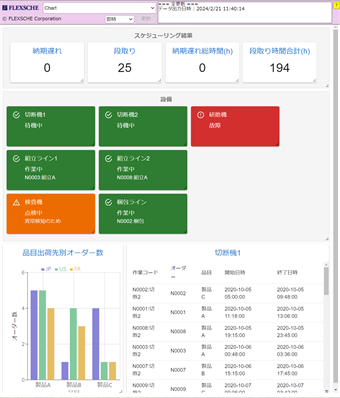 它显示排产结果的交期延误数量以及机器的运行状况。随着排产结果的改变,仪表板显示也会相应变化。此外还能显示图表等。
