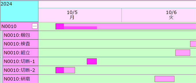 根据工作实际完成的进度日期,作业甘特图条形图的颜色将部分变化,显示效果与FLEXSCHE GP相同。